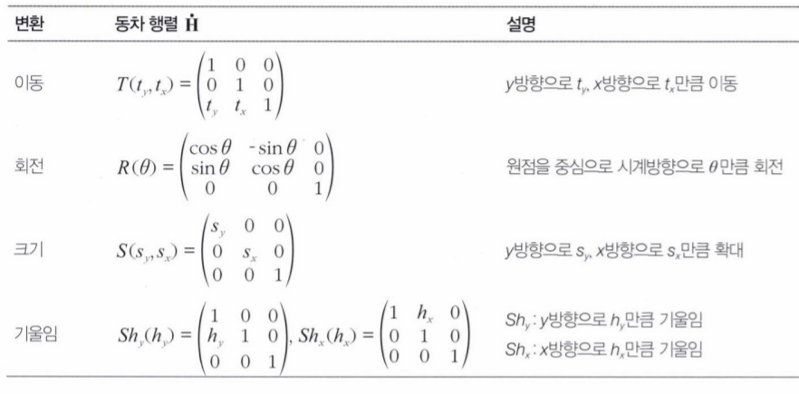기하 변환은 동차 좌표homogeneous coordinate와 동차 행렬homogeneous matrix로 표현한다. 이 표현에서 2차원 상의 점 x = (y,x)는 세 개의 값을 가진 3차원 벡터로 표현된다.
