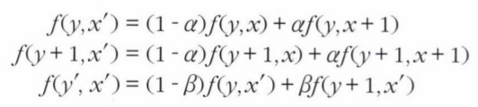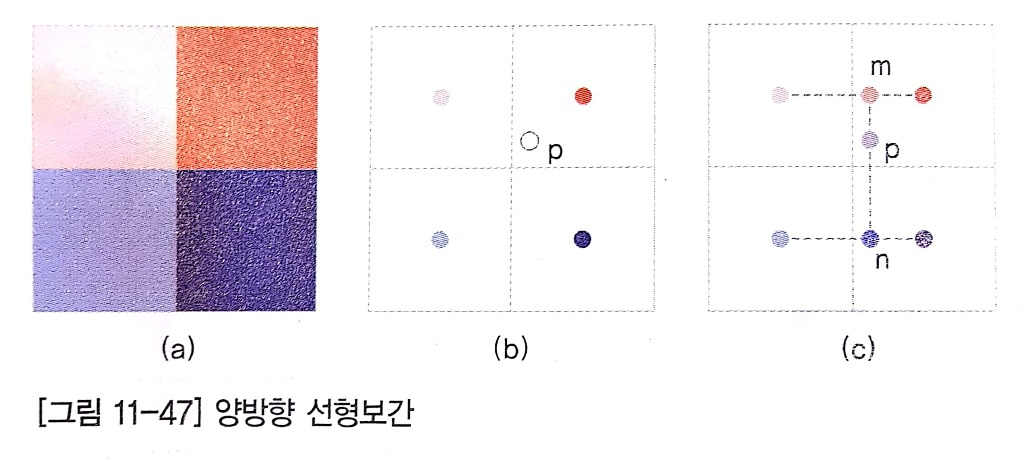 가장 가까운 네 개의 점을 구하여 위의 식에 대입하여 f(y', x')을 구하게 되면, 최근접 이웃 방법보다 계산 시간은 더 걸리지만 영상의 품질은 더 뛰어나다. 이 기법은 선형 보간Linear Interpolation을 이용하는데, 두 방향에 걸쳐 수행하므로 양방향 선형 보간bilinear interpolation 방법이라고 부른다.