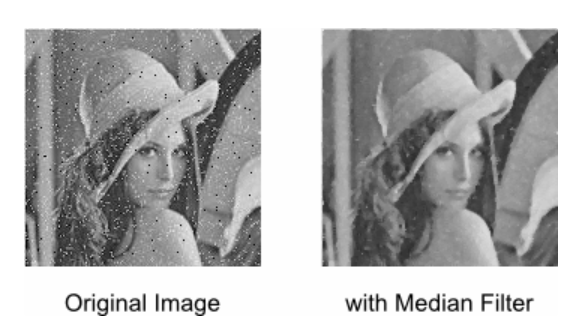 이웃과 차이가 큰 잡음이 있을 경우, 이웃 화소의 메디안을 취하여 차이를 줄여주기 때문이다. 메디안 필터는 특히 *솔프페퍼 잡음salt-and-pepper noise 제거에 매우 효과적이다.