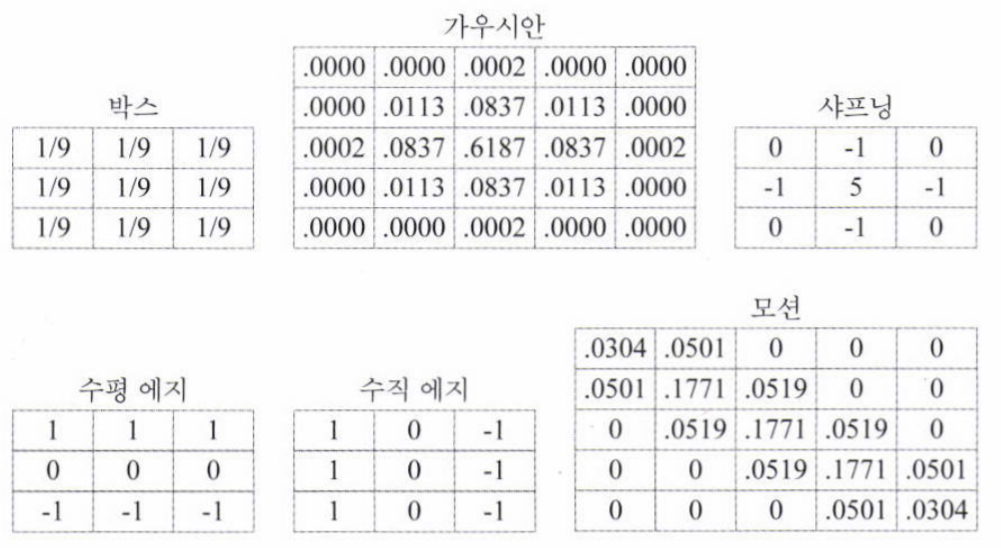 또하나 주의할 점은 결과를 입력 영상 f자체에 바로 기록하는 제자리in-place 방식으로 프로그래밍할 수 없다는 것이다. 다음 화소를 계산할 때 이전 화소의 값이 바뀌어 있으면 안 되므로 f와 다른 별도의 영상 g에 기록해야 한다. 보통 윈도우의 크기는 편의상 홀수로 한다.