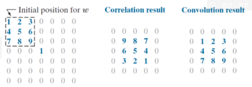 또한 바깥쪽으로 필요한 개수만큼 화소를 덧대고 0또는 가장자리 화소의 값으로 채우기도 한다.