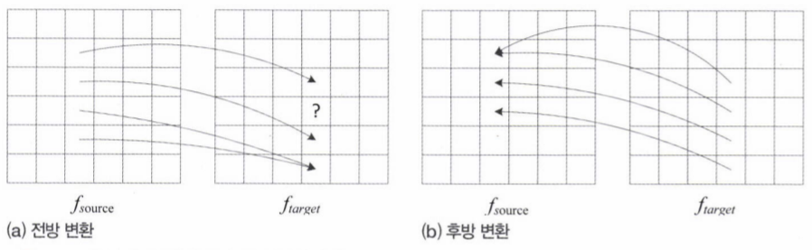 이를테면 (a)의 전방 변환에서 ?에 해당하는 좌표가 그렇다. 위의 사진과 같이 (b)에서는 target이미지가 source를 보고 직접 자신의 좌표에 해당하는 값을 찾아나서는 연산(역변환 행렬)을 사용한다.