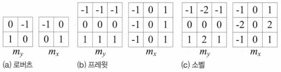 로버츠 연산자는 2×2이고 프레윗과 소벨은 3×3이다.