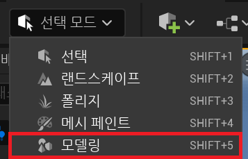 언리얼 엔진의 툴바에는 모드 윈도우가 있다.