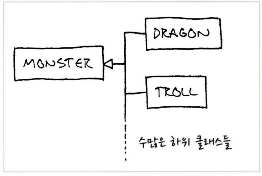 게임에 스폰된 모든 몬스터 인스턴스의 타입은 Monster라는 상위 클래스를 상속받는다. 종족이 많아질 수록 클래스 상속 쿠조도 커진다. 종족을 늘릴 때마다 코드를 추가/컴파일해야하는 문제가 생긴다.