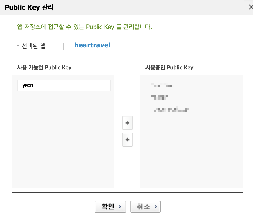 사용중인 Public Key에 등록한 키를 옮겨주고 확인을 누른다.
