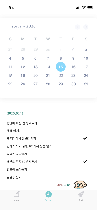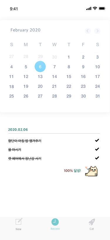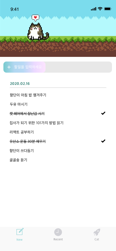 퀘스트 형식으로 저장한 할일을 완료하면 포인트를 얻는 방식이다. 얻은 포인트로 고양이에게 선물을 줄 수 있다.